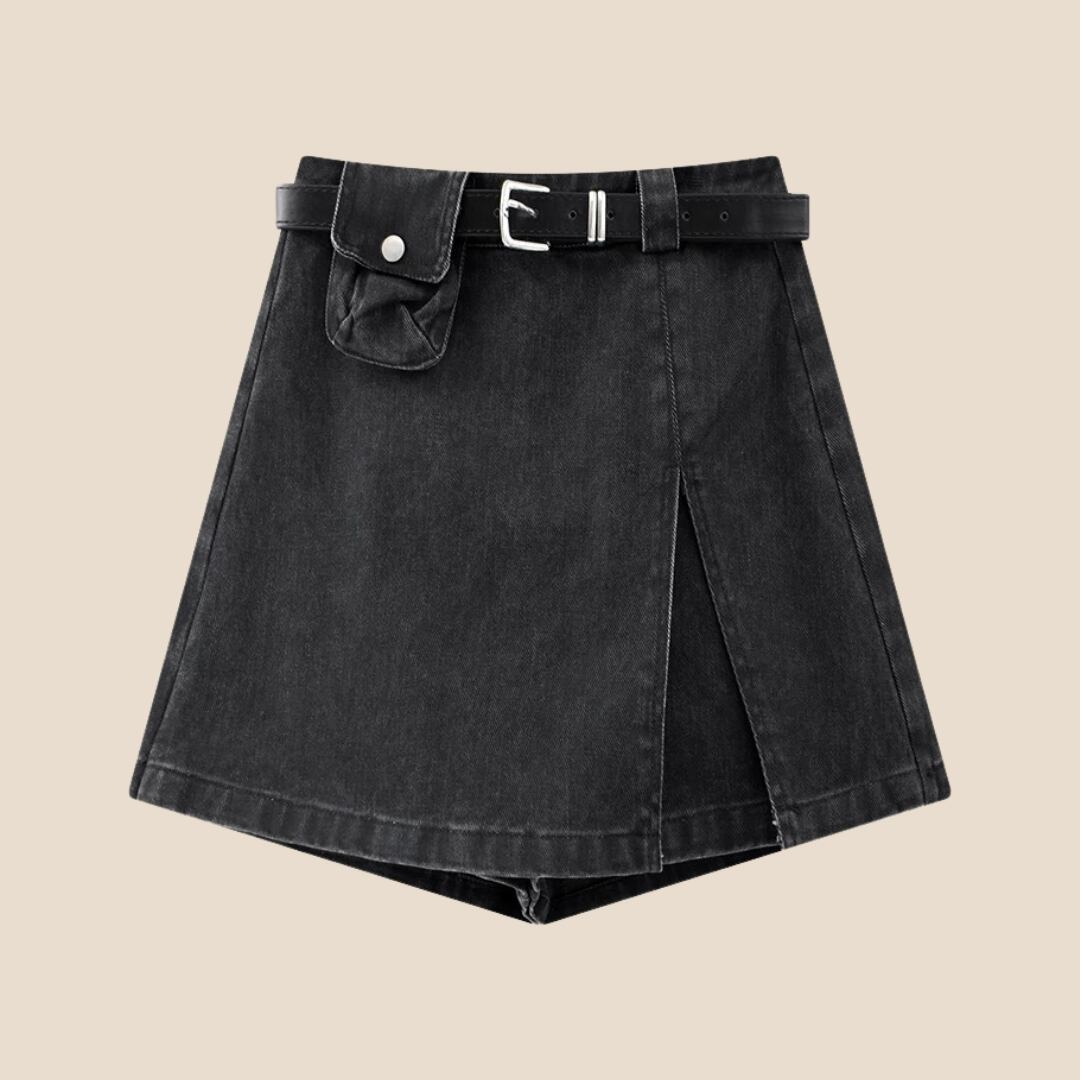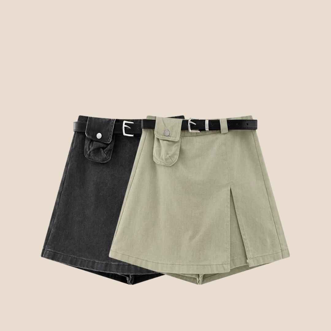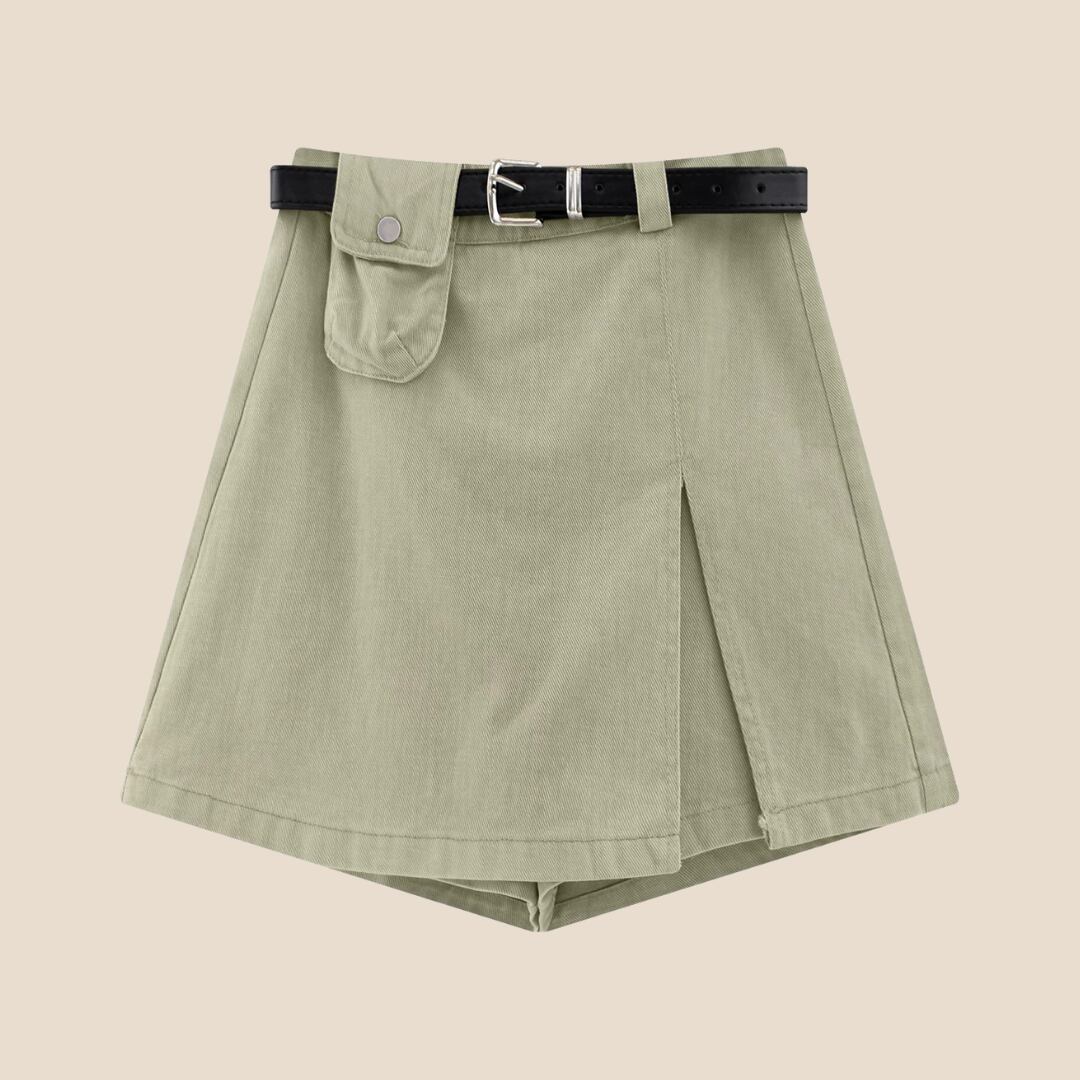 スタイリッシュなスリットデザインが魅力のベルト付きスカート。