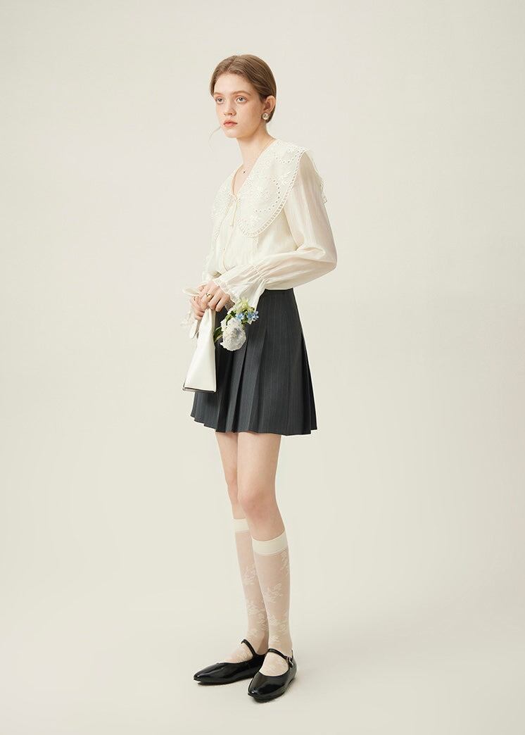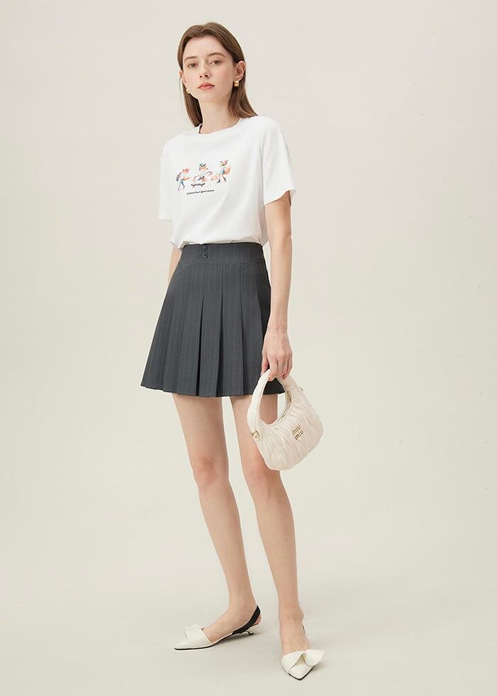 広がりを抑えつつ動きを見せるプリーツが可愛い、ストライプエイダプリーツキュロットスカート。