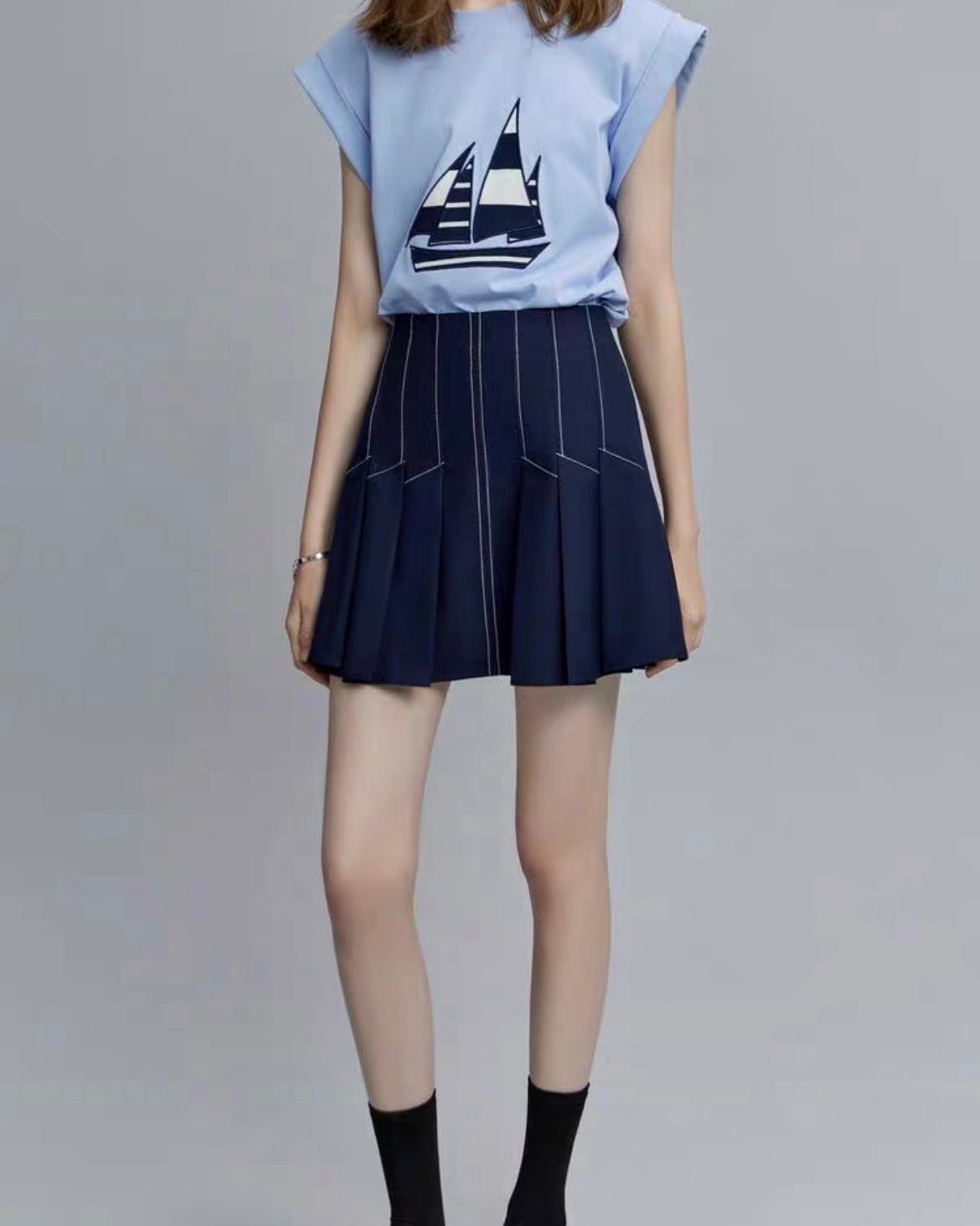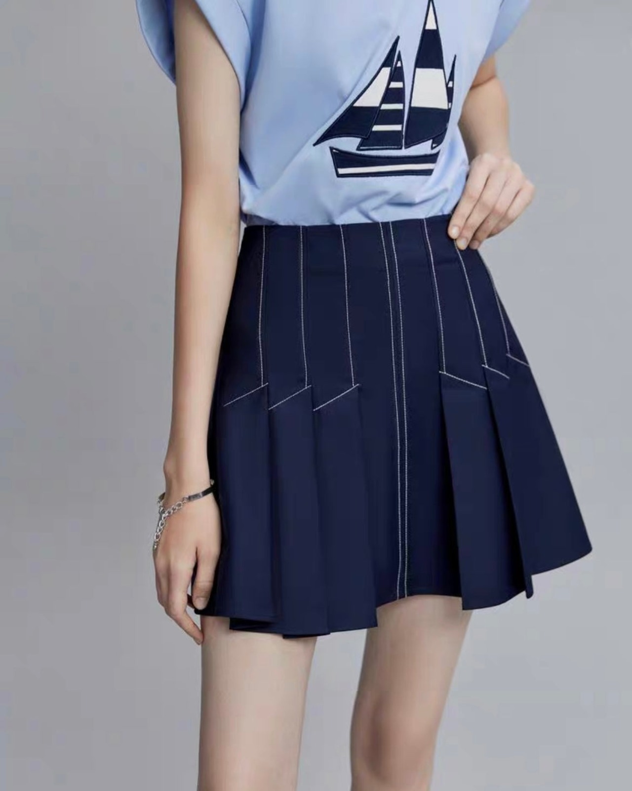 トップスを合わせやすいネイビーのワントーンで、程よく広がるプリーツデザインがゴルフ場でも目を惹く一枚に。