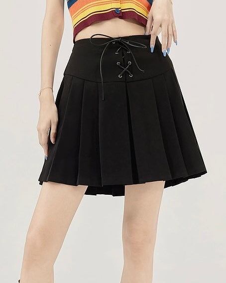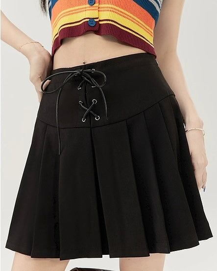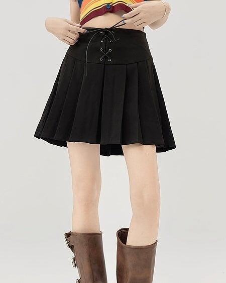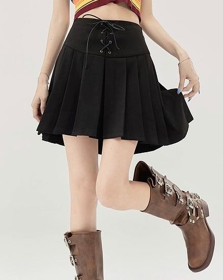 編み上げリボンがアクセントの、ストラップオフィーリアプリーツスカート。